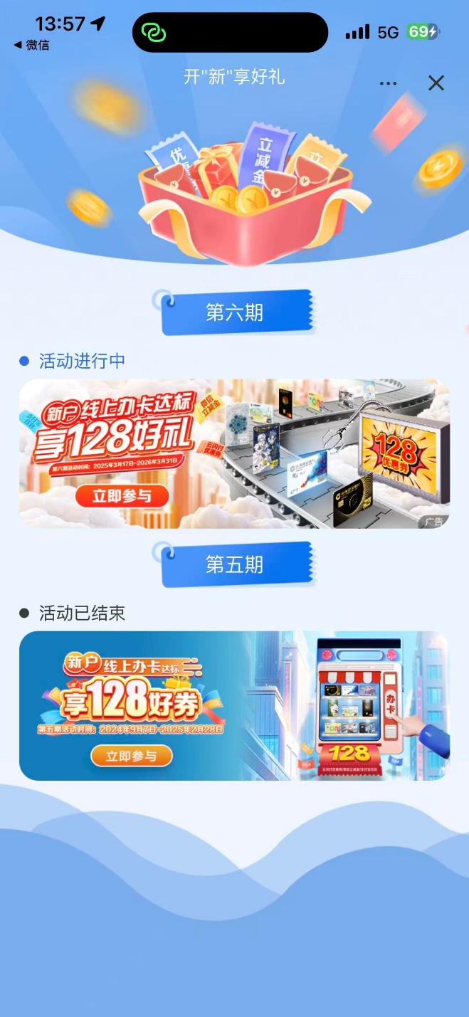 1、扫描二维码,进入新户办卡活动列表页。